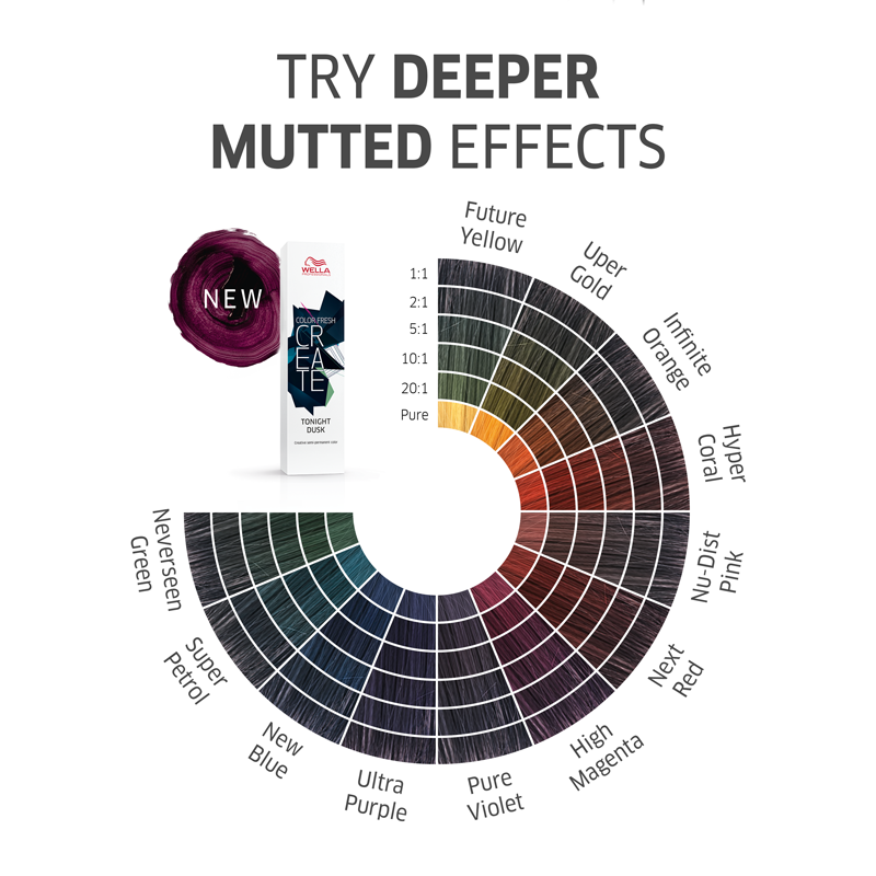 - Voor zachte effecten raden we u aan om de Color Fresh CREATE-kleur te combineren met Tonight Dusk voor diepere, donkere en zachte resultaten. Less is more! bv. 20:1 (20 delen Color Fresh CREATE + 1 deel Tonight Dusk)