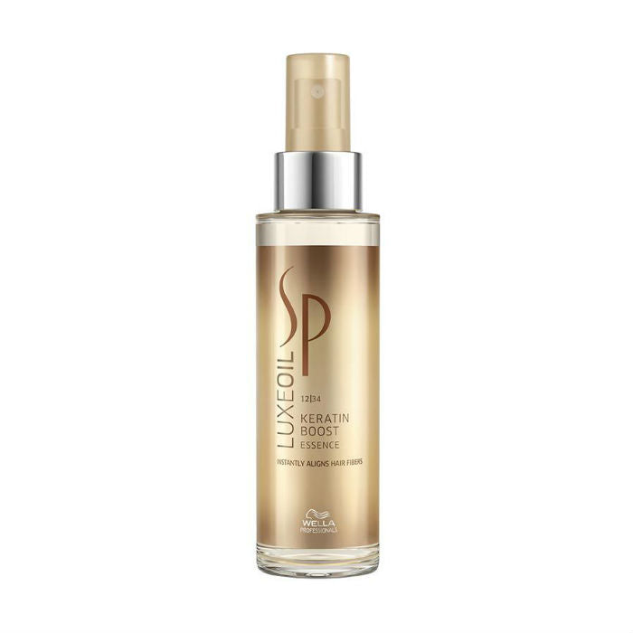 Wella SP Keratin Boost Essence is een haarspray die een voedende en hydraterende behandeling biedt aan het haar. Geschikt voor alle haartypes. De spray bevat argan- jojoba- en amandelolie. Deze oliën verzorgen het haar van binnenuit en dringen diep door in de haarstructuur. Dit zorgt ervoor dat het haar gevoed, gehydrateerd en gerevitaliseerd wordt. Wella SP Keratin Boost Essence geeft het haar een langdurige gladheid en maakt het haar beheersbaar en zijdezacht. Tevens bevat deze haarspray keratine, waardoor het haar wordt beschermd tegen de hitte van stylingtools en tegen schadelijke invloeden van buitenaf.